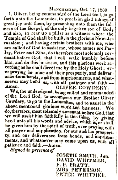 We, the undersigned, being called and commanded of the Lord God, to accompany our Brother Oliver Cowdery, to go to the Lamanites, and to assist in the above mentioned glorious work and business. We do, therefore, most solemnly covenant before God, that we will assist him faithfully in this thing, by giving heed unto all his words and advice, which is [sic], or shall be given him by the spirit of truth, ever praying with all prayer and supplication, for our and his prosperity, and our deliverance from bonds, and imprisonments, and whatsoever may come upon us, with all patience and faith. -- Amen.